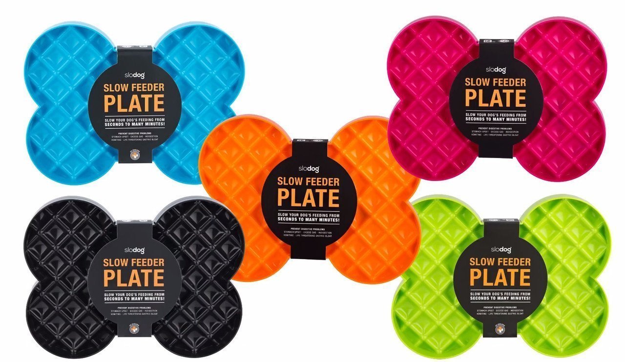 SloDog is a unique approach to slow-feeding and anti-anxiety.  By changing from a bowl to a plate, a much larger surface area becomes available to the feeding dog.  All the food is in plain sight and does not have to be chased, thus avoiding frustration.