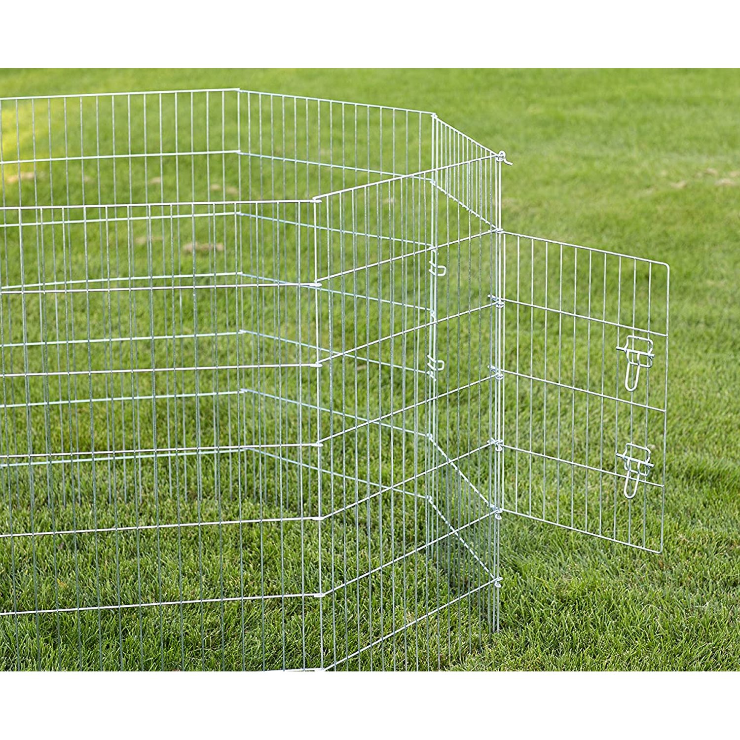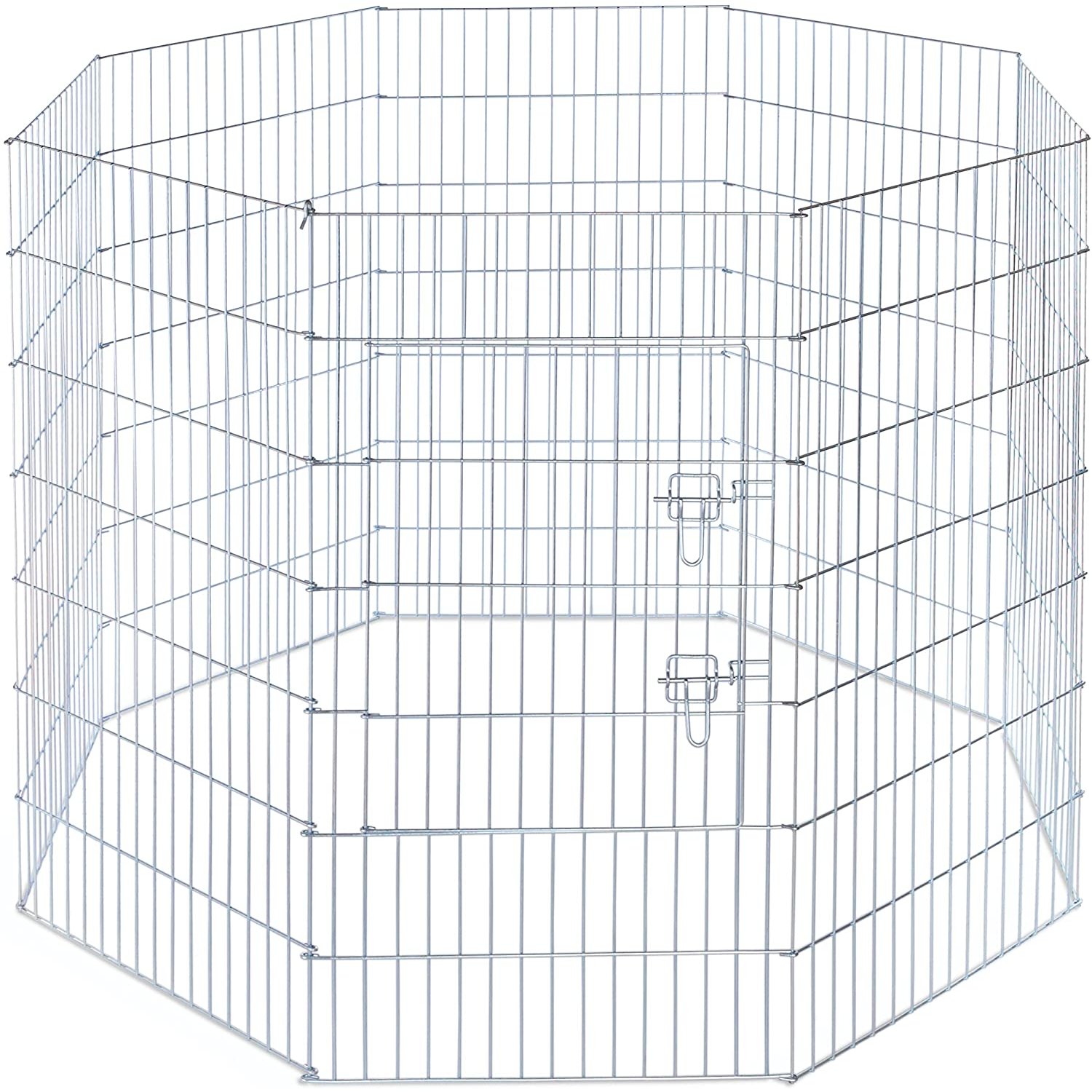 Prevue Pet Products Exercise Pen for Dogs 40142 is heavy duty and assembles easily, no tools required! 8 panel exercise pen features rust-resistant Bright Zinc finish over solid steel rods and includes grounding stakes. Ideal for small and medium sized dogs, each panel measures 24" Wide and 42" High. Front access door has 2 secure latches and measures 18 1/4" Wide and 23 1/4" High. Exercise Pen folds flat for storage or travel and measures approximately 57" in diameter when assembled. To set it up simply take it out of the box, make sure the door is in the lower registry of the main panel, slide the connector pin (4 1/2" L) through the connection loops and it's good to go. Additionally, the 4 grounding stakes can be used to secure exercise pen into soil.